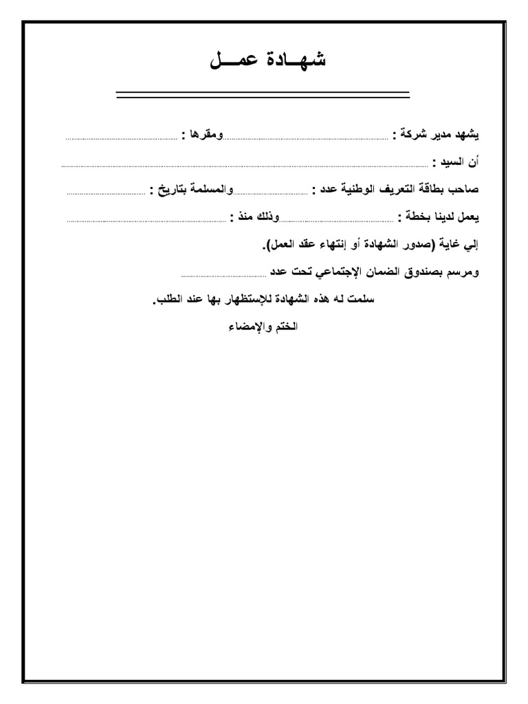 نموذج شهادة عمل في شركة.